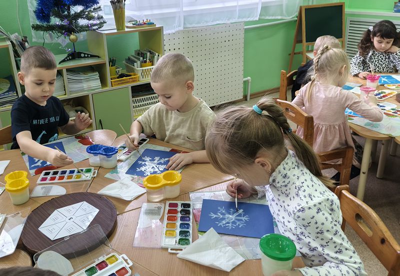 Перед занятием воспитатель, Смирнова Н.В, совместно с детьми, рассматривали окна в группе с разными формами снежинок, отгадывали загадки, читали стихи про снежинки, сделали физкультминутку "Снежинки падают...".