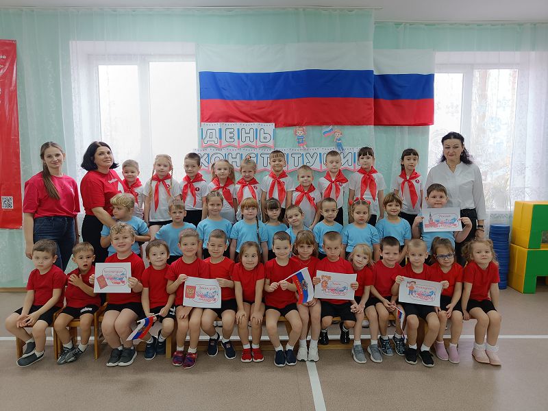 Праздник начался с гимна РФ, затем дети узнали, что же такое "Конституция», познакомились с правами и обязанностями, закрепили знания о символах РФ. С инструктором по физической культуре Чернышевой Е.П. дети выполнили комплекс общеразвивающих упражнений под музыкальное сопровождение с флагами РФ.