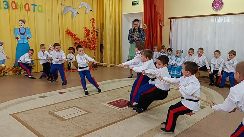 Сегодня в нашем детском саду приняли в казачата детей из группы «Васильки». Сотник Н.В. Бутько совершила этот обряд, прикоснувшись нагайкой к плечу мальчиков. Ребята-казачата веселились от души, играя в казачьи игры!