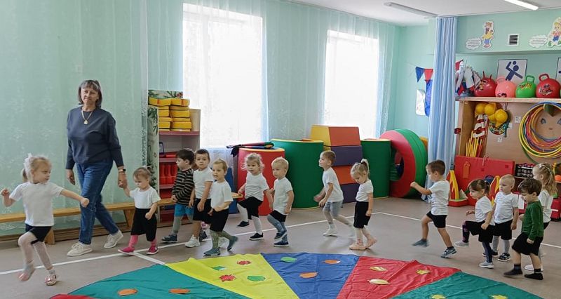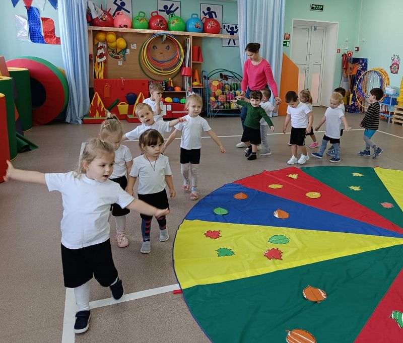 Продолжили осеннюю тему на физкультурном занятии. Дети бегали, ходили, переступая через «лужи», играли с листочками. Имитировали движения медведей, зайчиков.