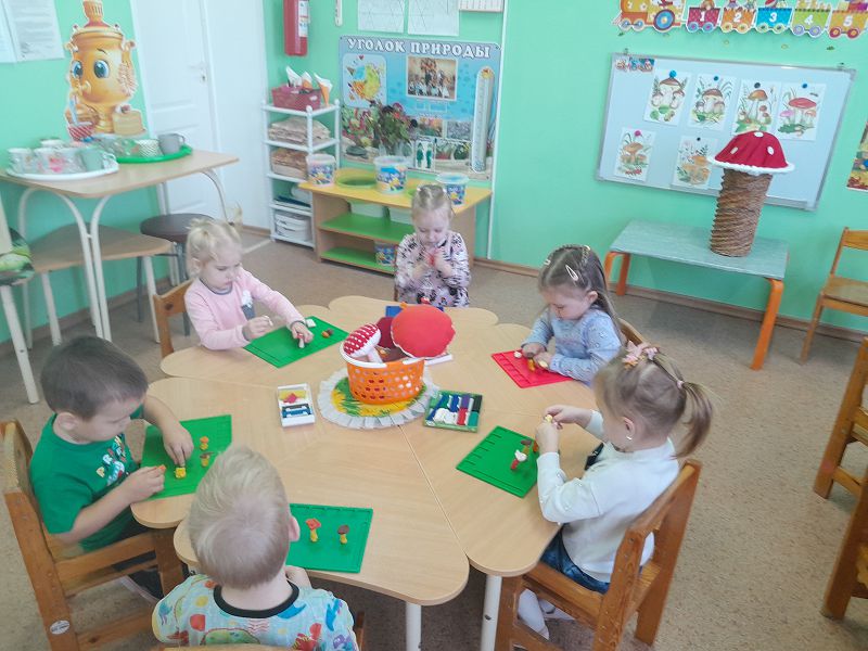В младшей группе "Одуванчики " прошло занятие по художественно - эстетическому развитию (лепка) "Грибная поляна". Дети с удовольствием лепили грибы, рассматривали иллюстрации, поиграли в игру "Собери грибы в корзину ". В конце занятия, все грибочки поставили на поляну и полюбовались ими.