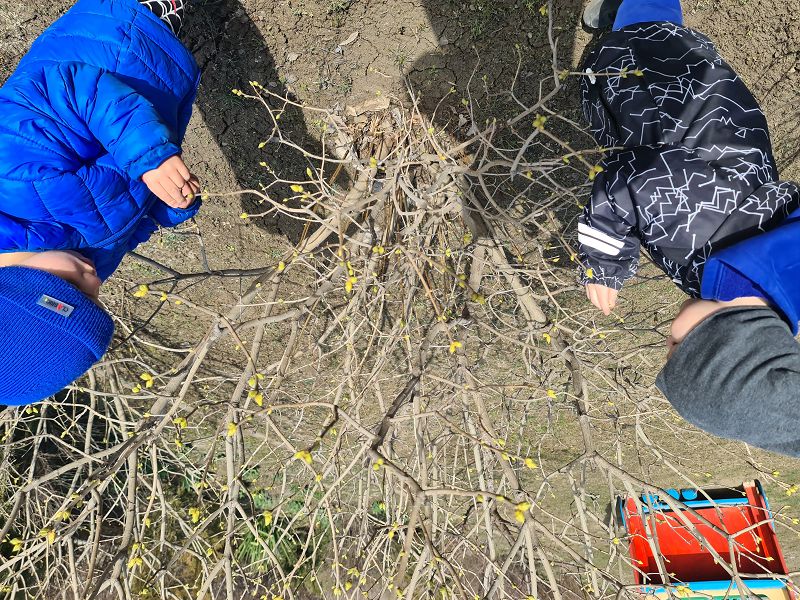 Ранее мы рисовали ветку сирени, затем сравнили её с сегодняшней и увидели, как набухли почки. Рассматривали картинки и называли первые весенние цветы. На улице продолжили наблюдать за первыми цветами и насекомыми, которые есть у нас на участке. Повторили правило сохранения природы: рвать, топтать цветы нельзя.