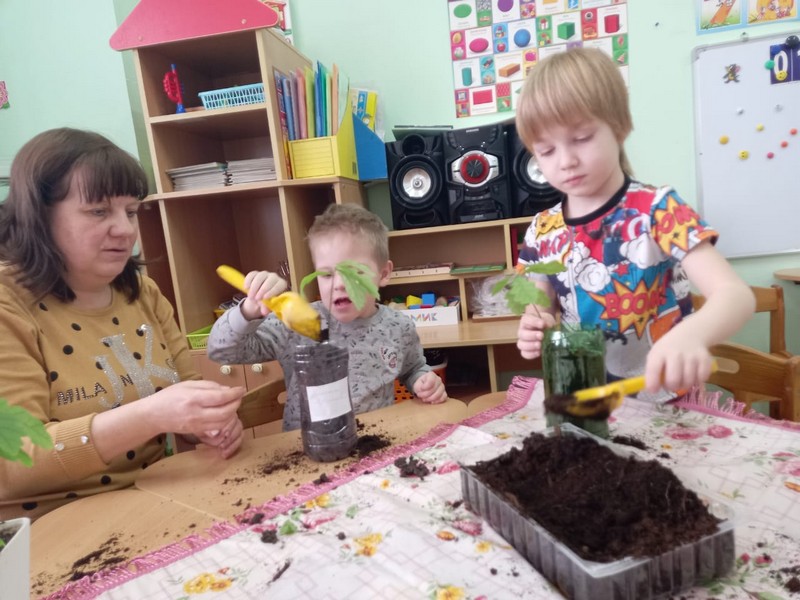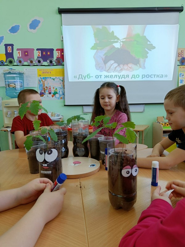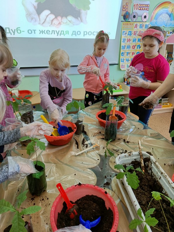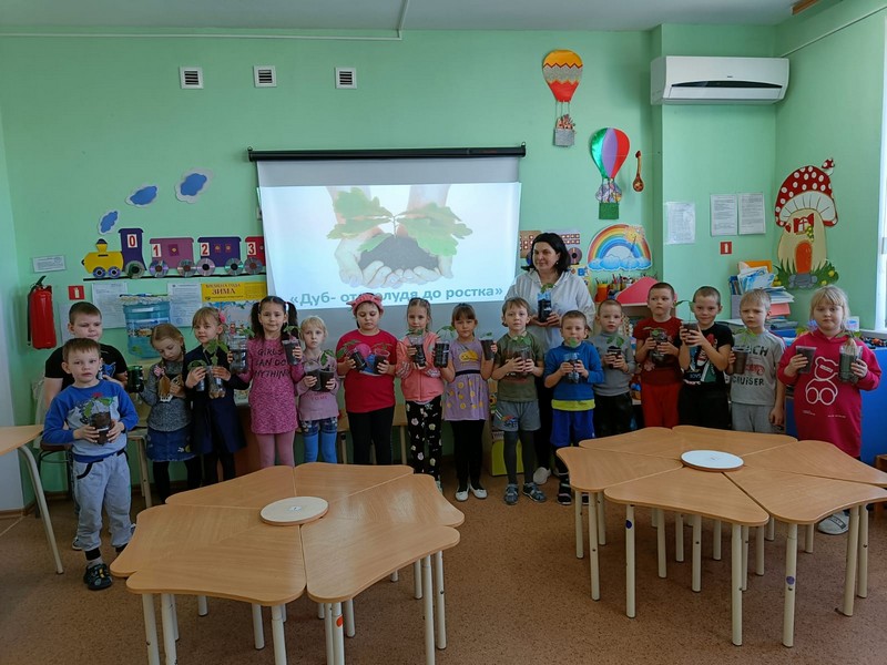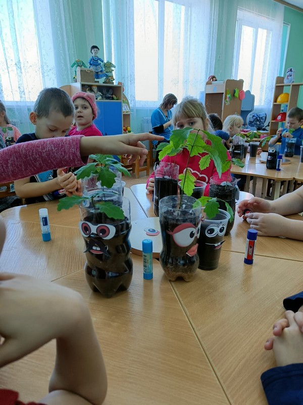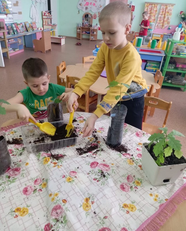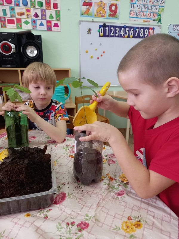 Экологический проект «Посади дерево» начался у нас случайно. Нам принесли жёлуди в бутылке, но когда мы её открыли – получился звук, как будто открыли газировку! Сделали с детьми вывод: жёлуди дышат, они живые! Прорастили корешки, посадили в землю. И вот наступила пора их пересадить в отдельные горшочки. Наши будущие выпускники принесли каждый свою баночку с землёй! Воспитатели разновозрастной группы «Ромашки» - Чернега Н.Н. и воспитатель подг.группы «Колокольчики» Уварова Н.А. подписали каждый горшочек, куда дети очень бережно, по всем правилам посадили своё деревце. Теперь они будут за ними ухаживать, а весной высадят рядом с территорией детского сада и у нас родится аллея выпускников!