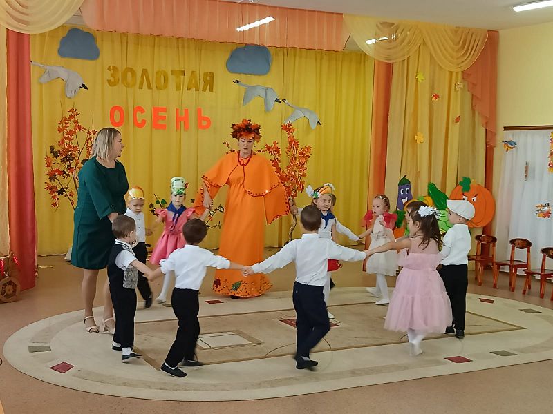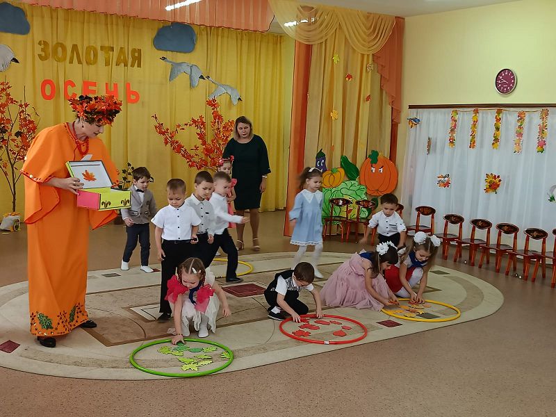 В осенний лес были приглашены дети и гости из группы «Одуванчики». Волшебница Осень-затейница водила с детьми хороводы, слушала стихи, просила ребятишек, чтобы они украсили коврики осенними листочками. Девочки станцевали танец «Капельки», вместе с мальчиками красиво играли на музыкальных инструментах – получился настоящий осенний оркестр.