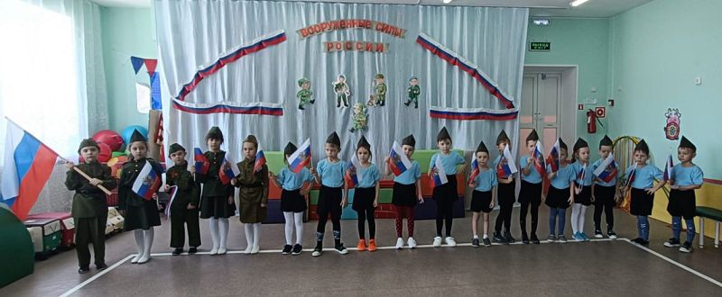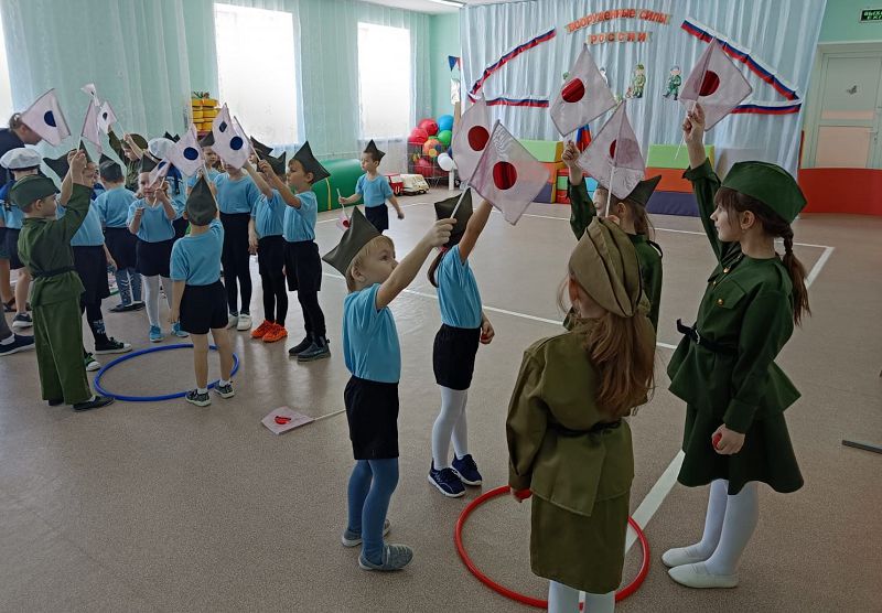 Все дети среднего и старшего возраста с российскими флажками собрались в физкультурном зале. После прослушивания гимна мы устроили строевой марш и поиграли в игру «Найди флажок и соберись в кружок».