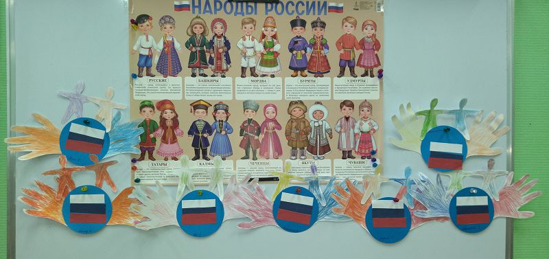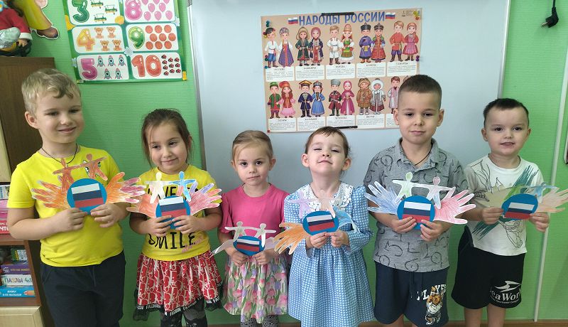 Воспитатель, Смирнова Н.В. познакомила ребят с историей России и с праздником, посвященному Дню народного единства. Дети узнали какие народы живут в России. Вспомнили и уточнили трёхцветное значение флага. Сделали аппликацию.