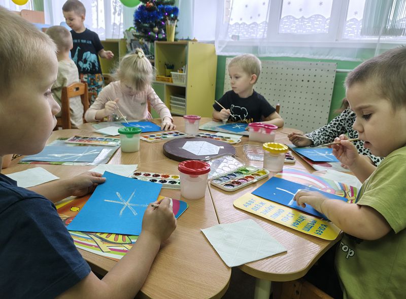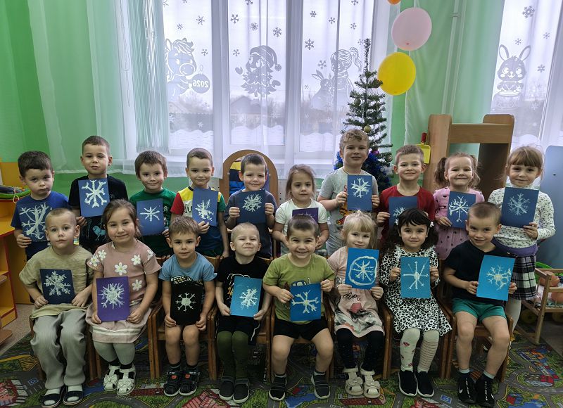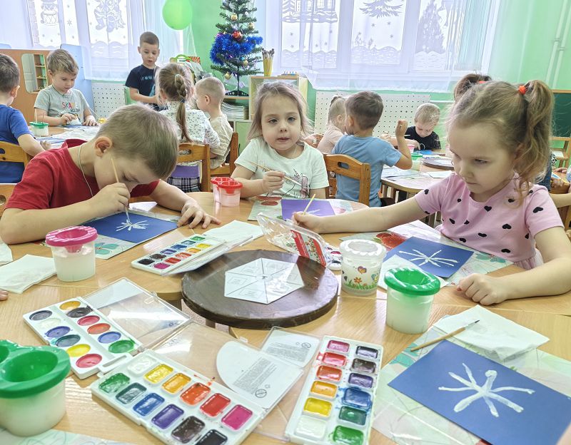 На занятии, ребята научились рисовать красками снежинку и закрепили умение рисовать кончиком кисти.