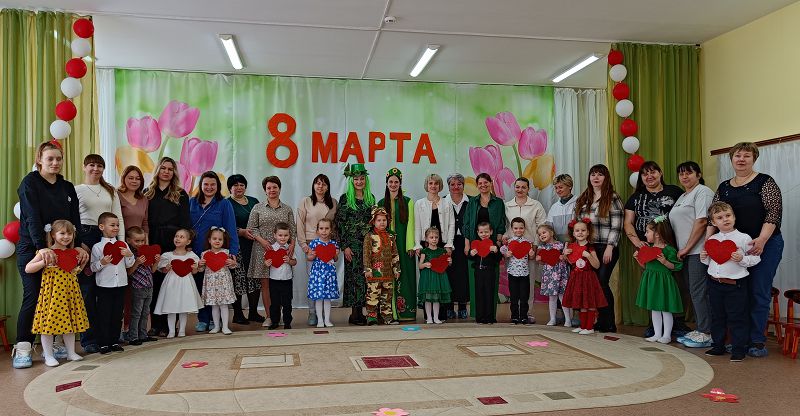 Главное слово «Мама» - детям подарила Весна, но Кикимора его украла и не хотела возвращать. Но ребята её задобрили песнями, танцами, играми и стихами. На праздник пришёл маленький Леший – у которого нет мамы. Кикимора его усыновила и стала доброй – слово «Мама» они вернули!