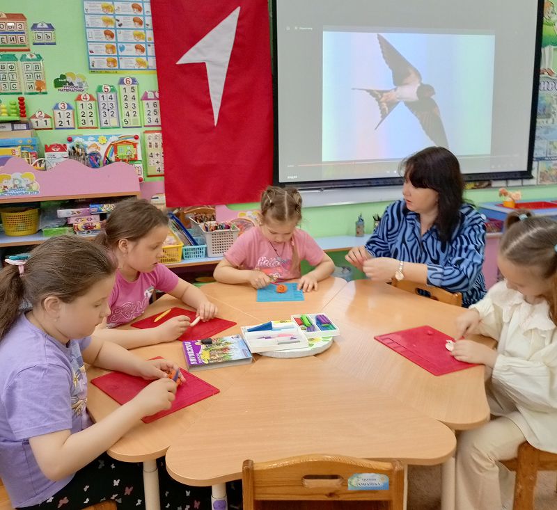 Учитель-логопед Наталья Викторовна, рассказала ребятам о птицах, среде их обитания, пользе для человека и природы, особенностях зимующих и перелетных птиц. Ребята посмотрели презентацию о пернатых друзьях, послушали пение птиц, отгадывали загадки, с интересом рассматривали картинки с изображением разных птиц, прочитали сказку «Домик для воробья». Все вместе слепили жаворонков из пластилина, согласно народным приметам эти птицы приближают весну.