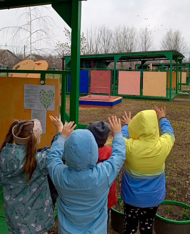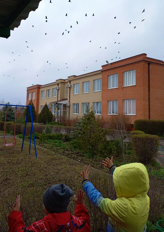 На прогулке воспитанники закрепили знания о птицах, с восторгом поприветствовали пролетающих мимо детского сада стаю грачей.