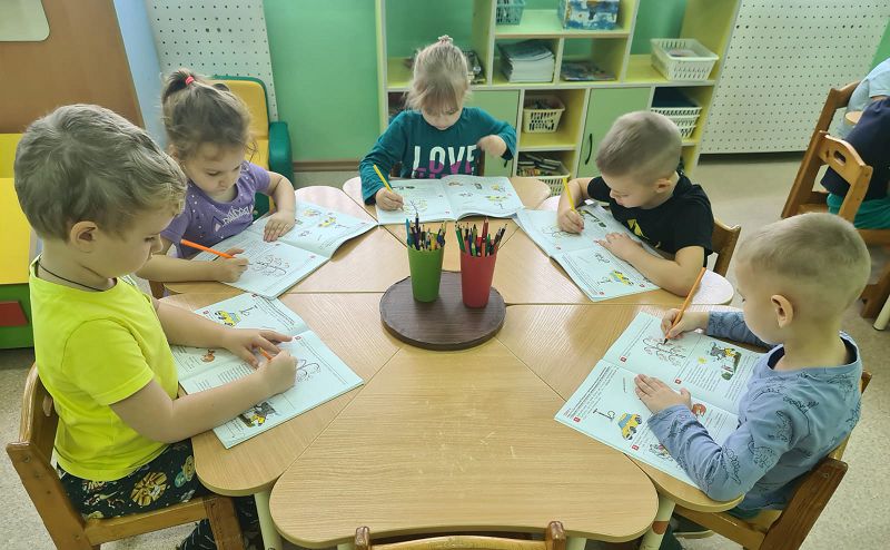 Сегодня, на занятии по обучению грамоте, в средней группе " Васильки", дети познакомились с твёрдыми и мягкими согласными звуками "С-Сь" Цель занятия: побуждать различать и произносить изолированные звуки в игровых упражнениях. В играх "Песенка насоса", "Подскажи словечко", "Кто внимательный", "Раскрась листья" дети постигали основы грамотности. Провели физминутку "Пальчики".